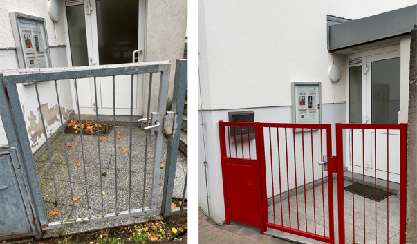 Es tut sich was: Das Eingangstor zur TV-Halle erstrahlt in neuem Glanz! Der ehemals graue, in die Jahre gekommene Anstrich wurde durch ein kräftiges Rot ersetzt – ein erster sichtbarer Schritt hin zur bereits geplanten Neugestaltung der gesamten Hallenfassade.